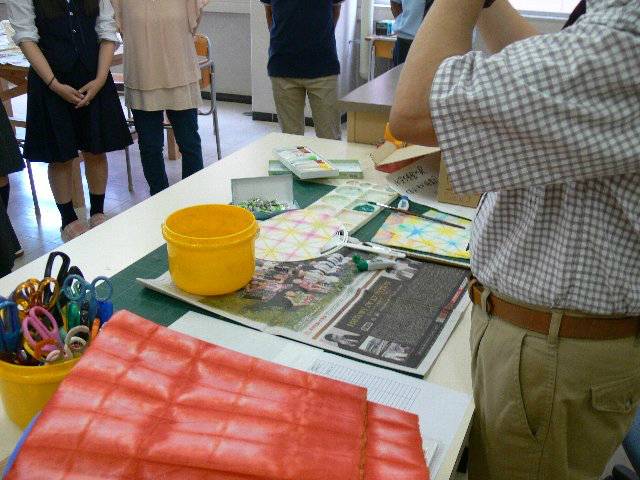 保育科・福祉科両科共通の授業体験では、「うちわ作り」を体験しました。和紙に好きな模様で紙染めをして、それからうちわの骨に貼りました。